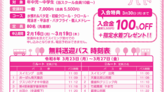 2月中に入会すると入会金100%オフ(通常5,500円)となります!さらに、体験したお子様には指定水着をプレゼ…
