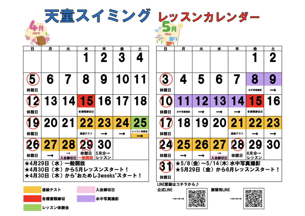 レッスンカレンダー / 令和7年度 年間行事予定 2026年3月1日 最終更新日時 : 2026年3月2日 スイミング天童 スクール会報「らっこ」は当面の間休止させていただきます 2月・3月レッスンカレンダー 2月・3月レッスンカレンダー(PDF) 4月・5月レッスンカレンダー 2ヶ月先のカレンダーは変更になる場合があります。 4月・5月レッスンカレンダー(PDF) 令和7年度 年間行事予定 令和7年度年間予定表 FacebookXBlueskyHatenaCopy